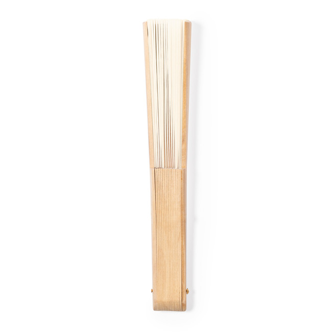 Ventaglio realizzato con aste in legno e tessuto di cotone in combinazione con poliestere. Di colore naturale e presentato in una scatola individuale dal design kraft.