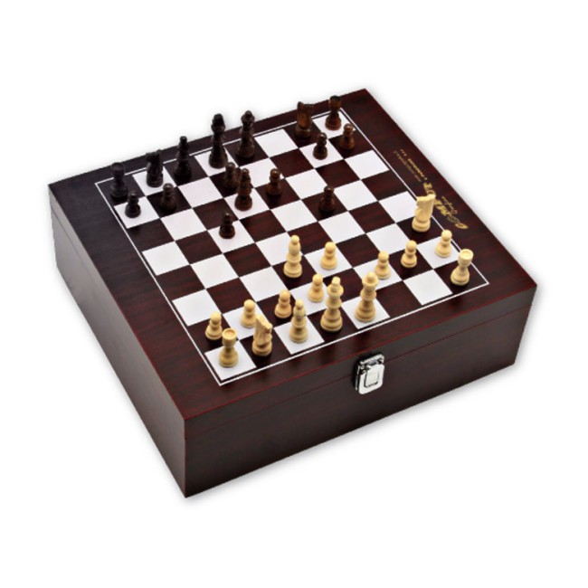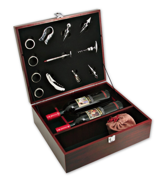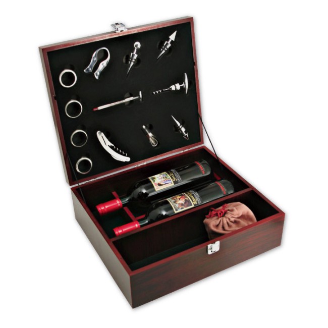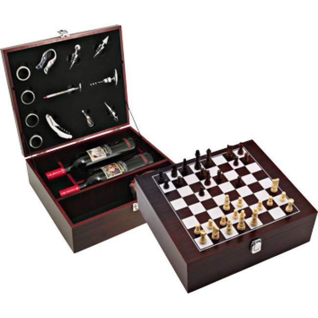 Pregiata scacchiera in legno WRC, per giocare a scacchi e a dama. Con all'interno set da vino composto da 2 apribottiglie, termometro per misurare la gradazione del vino, 4 tappi, 4 salvagocce, svitatappi in metallo cromato e doppio scomparto per due bottiglie.Confezione in scatola di cartoncino bianco.