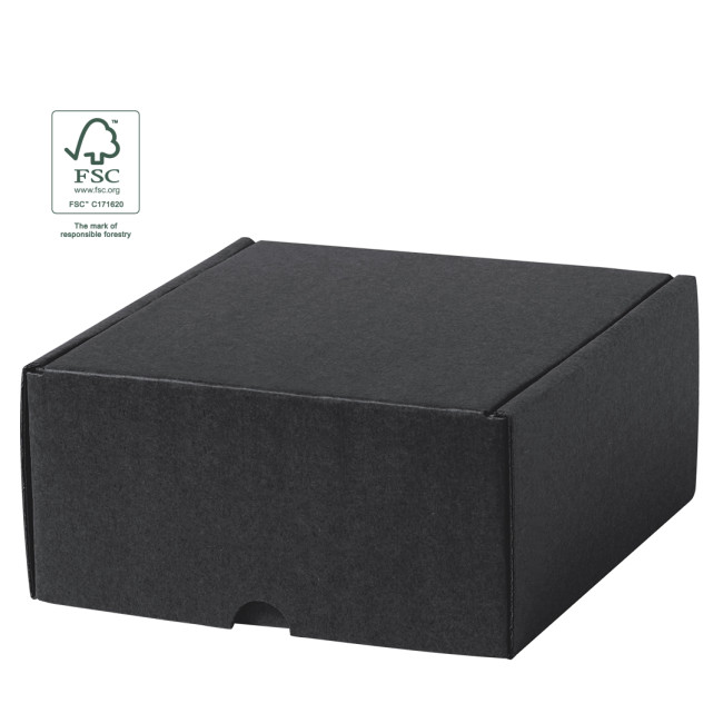 Scatola di presentazione di dimensioni S realizzata in cartone ondulato di colore nero. In linea con la tendenza di mercato verso la sostenibilità, offre soluzioni per migliorare e conservare il nostro pianeta.