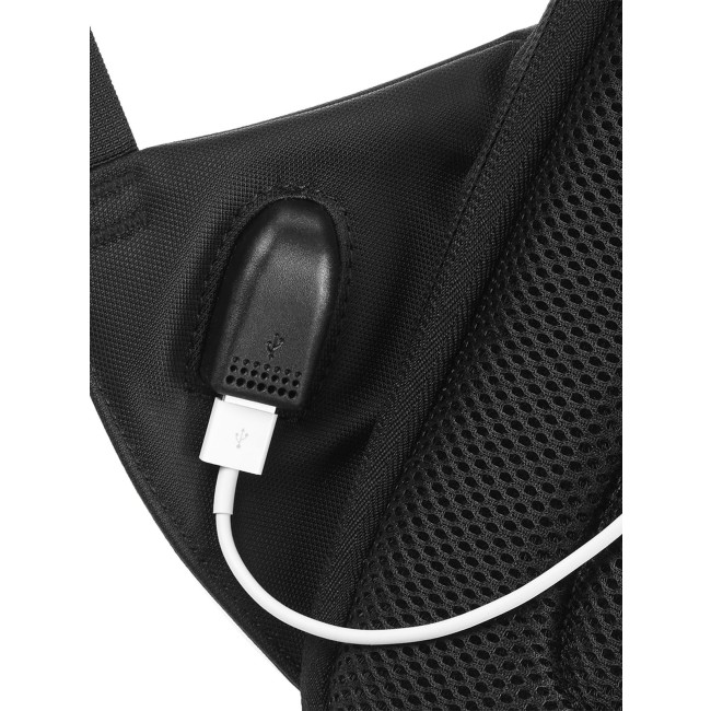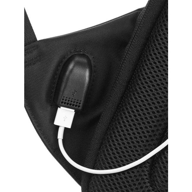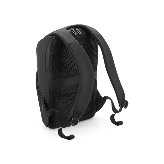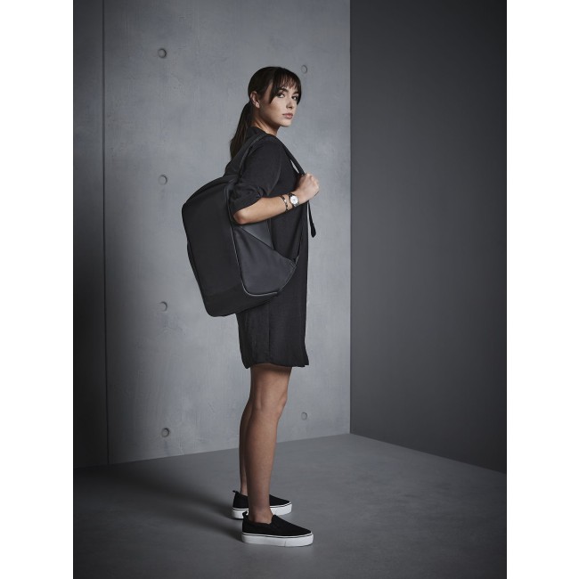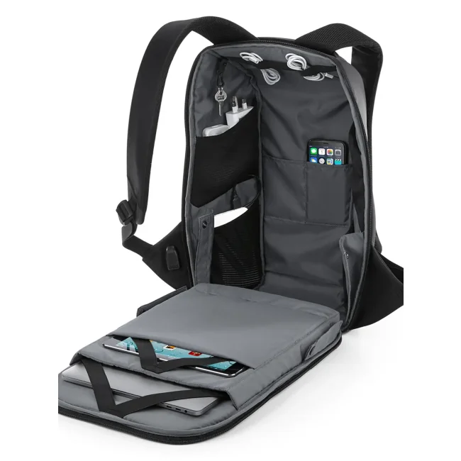 100% combinazione di poliestere rivestito in nylon Jacquard/PU. Zaino con tasca principale con apertura nascosta, stile minimal, scomparto per laptop fino a 15,6" imbottito, tasca con cerniera nascosta nel pannello sul retro, diverse tasche interne, porta di ricarica USB integrata. Dimensioni: 30.5x46x17 cm, capacità: 15 litri, area stampabile: 15x25 cm.