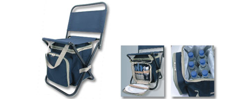 Sedia pic-nic con borsa termica in polyestere 600D colore blu, finiture beige. Set pic-nic composto da piatti, bicchieri, posate e tovaglioli per uno.