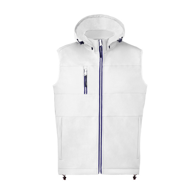 Gilet in materiale soft shell 300g/m2 resistente e traspirante. Taglio moderno, con zip centrale, tasche laterali e pratica tasca sul petto con chiusura a zip e tirazip a contrasto. Collo alto con cappuccio regolabile e staccabile. Orlo inferiore con coulisse regolabile. Guscio esterno in soft shell resistente al vento e all'acqua e calda fodera in micropile in colore a contrasto. Disponibile nelle taglie XS, S, M, L, XL, XXL.