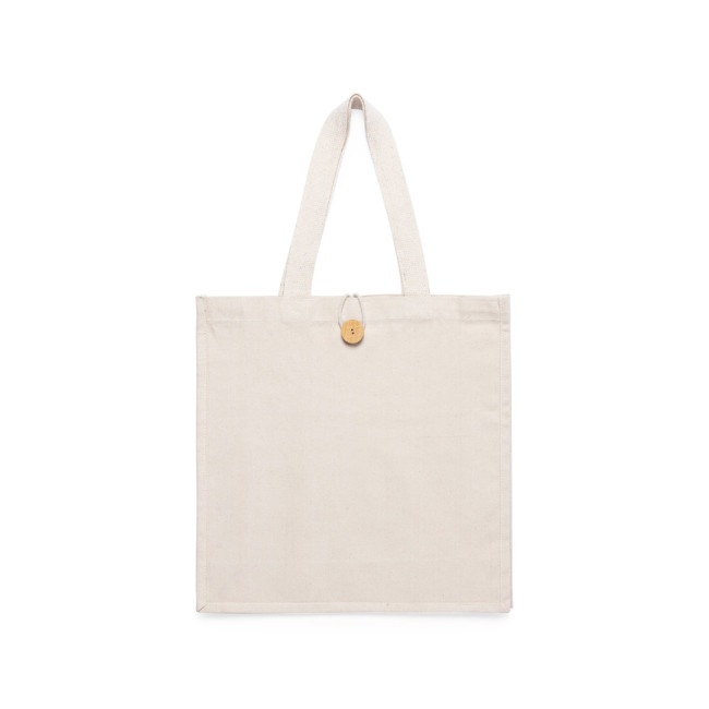Borsa realizzata in cotone, finitura naturale e peso extra di 310g/m2. Con chiusura originale a bottoni, finiture cucite e soffietto. Manici medi extra larghi e rinforzati (60 x 3,5 cm). Resistenza fino a 10 kg di peso.