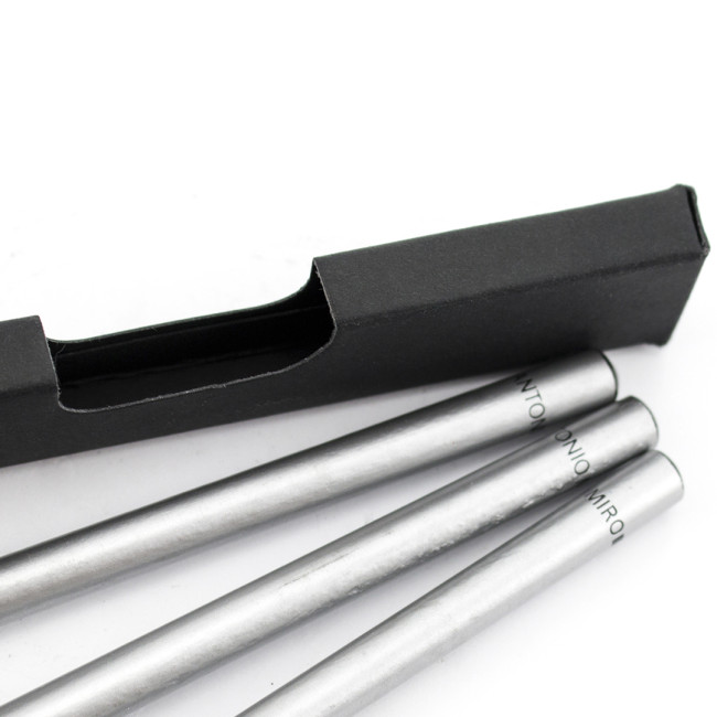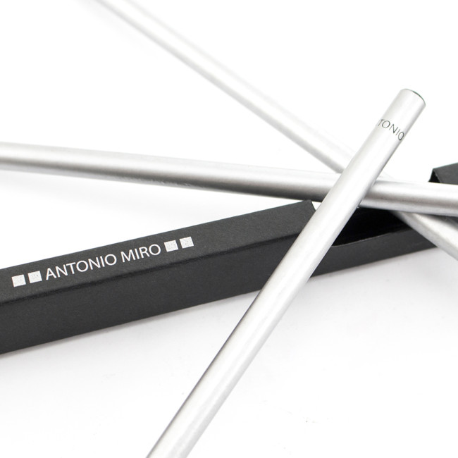 Set di 3 matite in legno by Antonio Miró in un'elegante finitura argentata, con logo del marchio sulla parte superiore. Presentate in un'elegante scatola di cartone nero con finestra e logo del marchio.
