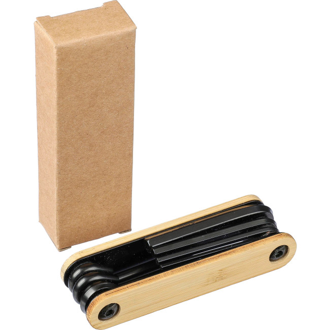 Set 7 utensili in acciaio e carbonio con dettagli in bambù, include chiavi a brugola, cacciavite a croce e cacciavite a testa piatta, confezionato singolarmente in una scatola in cartone avana