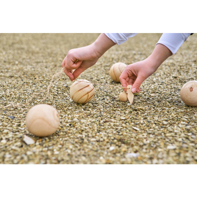 Set Bocce in legno, comprendente 6 palline (7 cm ciascuna) e 1 pallina più piccola (2 cm). Fornito con una corda ed è confezionato come set in una custodia di cotone con coulisse. Adatto per 4-6 giocatori e ideale per attività basate sull’agilità.