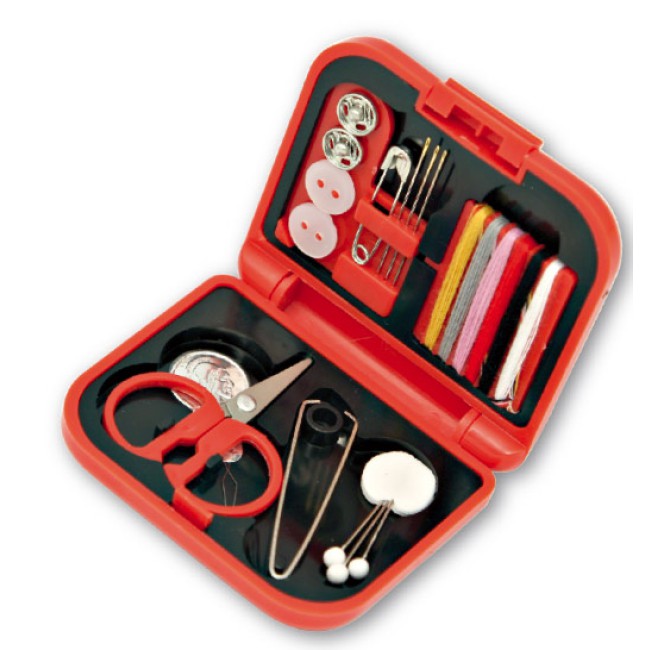 Set cucito in plastica rosso completo di forbice spilli aghi pinzetta spilla bottoni e fili colorati
