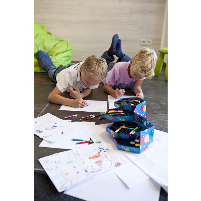 Set arte, 56 pezzi, pennarelli, acquarelli, matite, pastelli, temperamatite, gomma, in cofanetto esagonale, vari scomparti