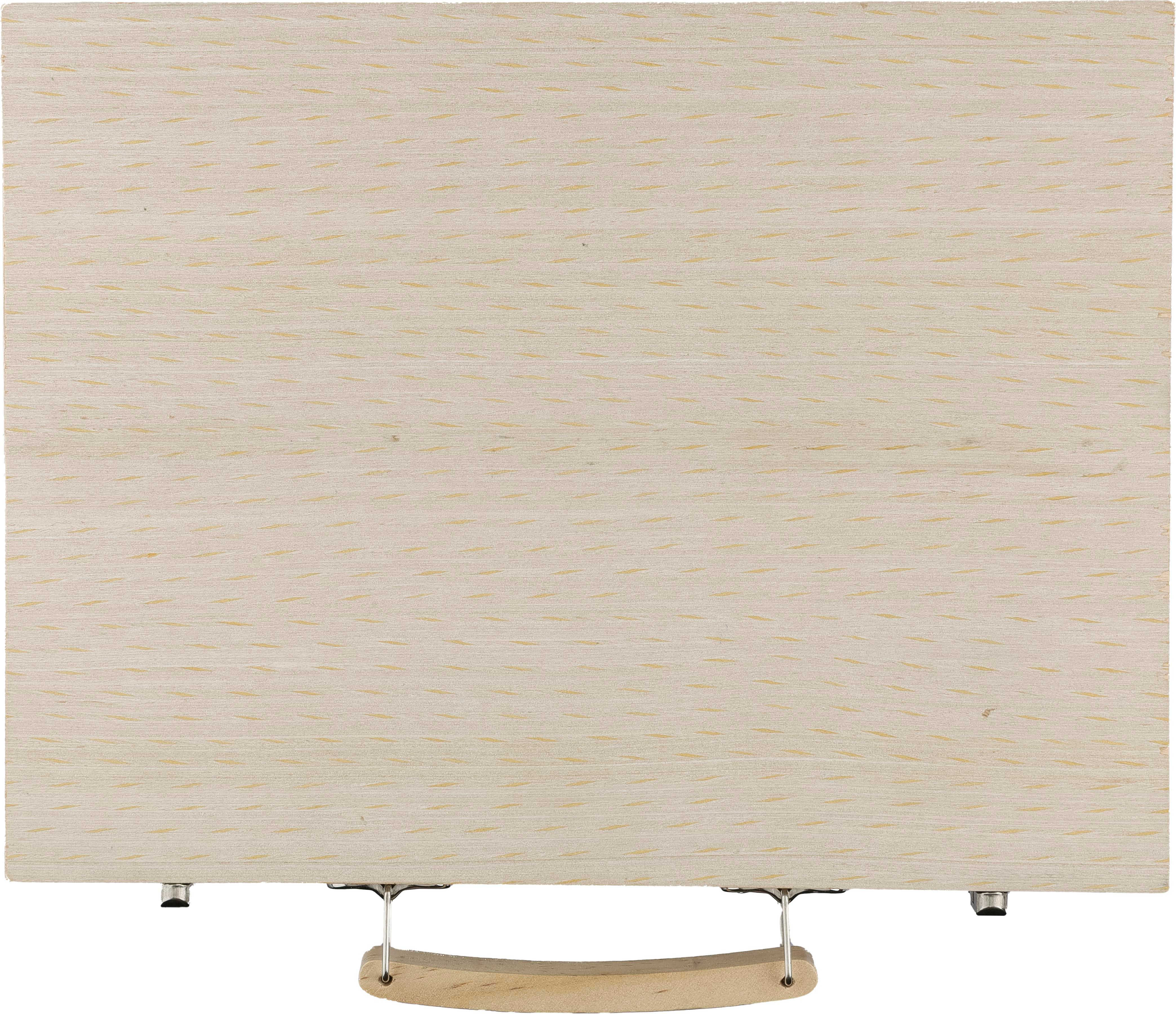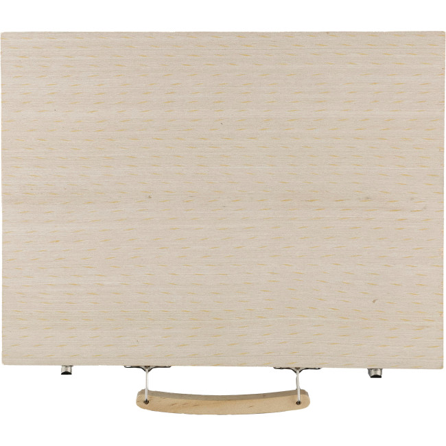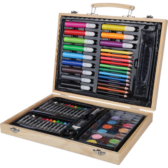 Set da disegno in compensato con custodia in legno di pino e manico in legno, contenente 66 pezzi: 12 pastelli a cera, 12 matite colorate (temperate), 12 pennarelli, 12 pastelli a olio, una colla stick, gomma, temperamatite, righello, pennello, 12 colori e una tavolozza. Confezionati singolarmente in una scatola di cartone avana, lasciando la maniglia accessibile per il trasporto.