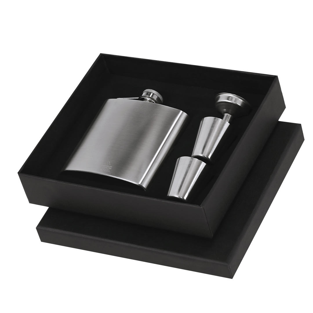Set composto da flacone di 175 ml in acciaio inox riciclato, dotato di sistema antigoccia e chiusura a vite. Include due bicchieri misuratori da 30 ml e un imbuto dosatore per facilitare il riempimento. Presentato in una scatola nera, questo set rappresenta una scelta sostenibile e pratica per l'uso quotidiano.