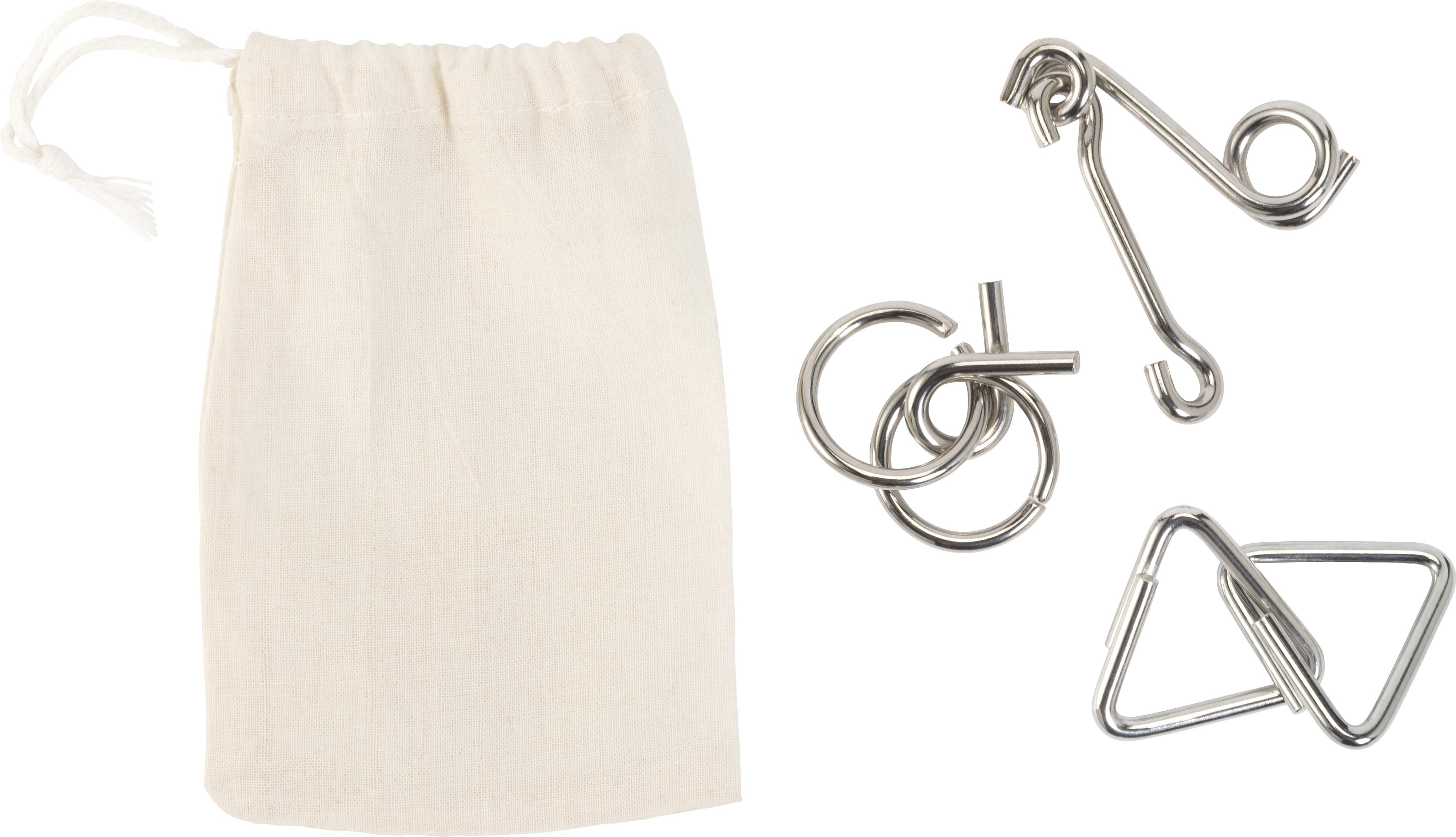 Set di tre giochi di logica in acciaio, confezionati in sacchetto di cotone 80 gr/m² con chiusura a cordoncino