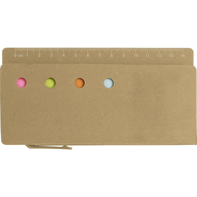 Set memo, righello 13 cm integrato, memo stick in 2 formati e in 5 colori totali, penna a sfera con corpo in cartone, refill blu