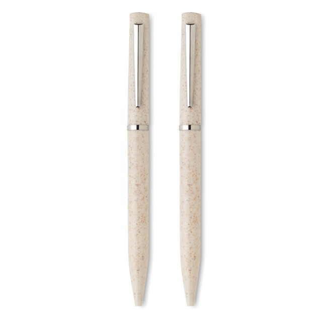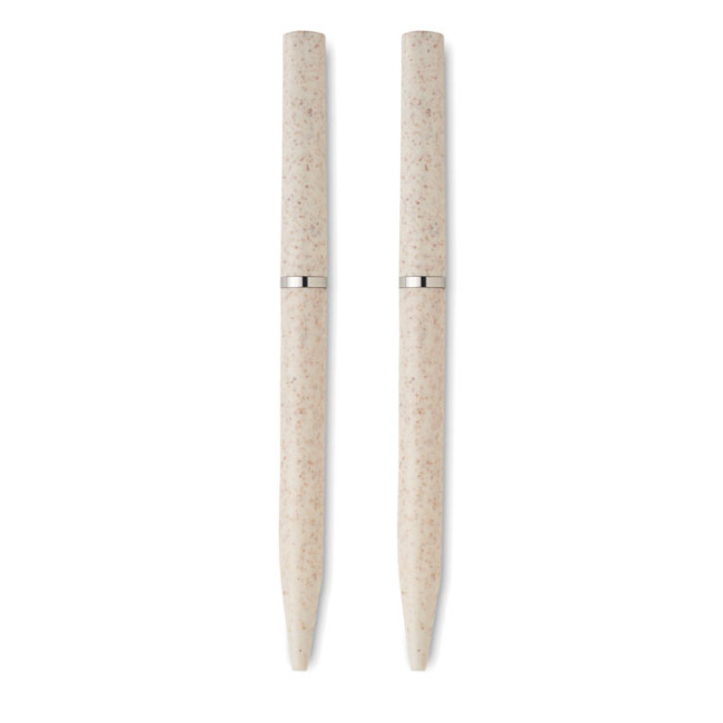 Set di penne a rotazione composto da una penna a sfera con inchiostro blu e una penna a sfera in grafite. Realizzato in paglia di grano e ABS, il set è presentato in una scatola di carta riciclata, contribuendo alla sostenibilità grazie alla certificazione FSC.
