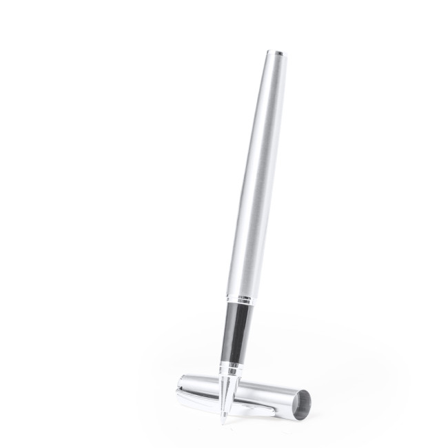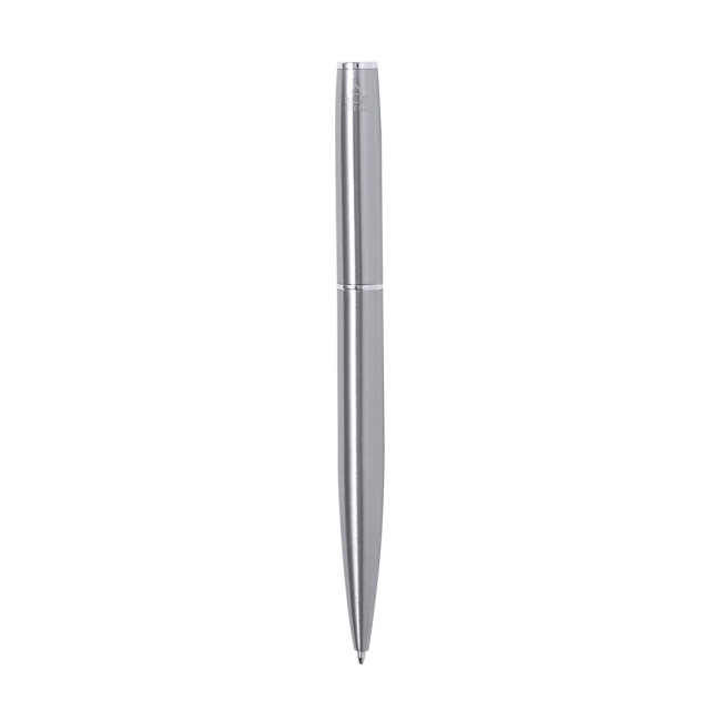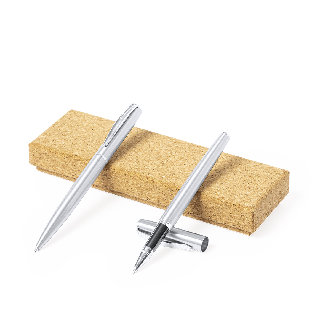 Set di penna biro e roller realizzato in acciaio inox riciclato, un materiale altamente riutilizzabile e durevole. La penna è dotata di meccanismo a rotazione e il roller ha un cappuccio, entrambi con clip in metallo e inchiostro blu. Presentato in un elegante astuccio di sughero, questo set rappresenta una scelta sostenibile e raffinata.