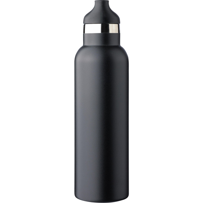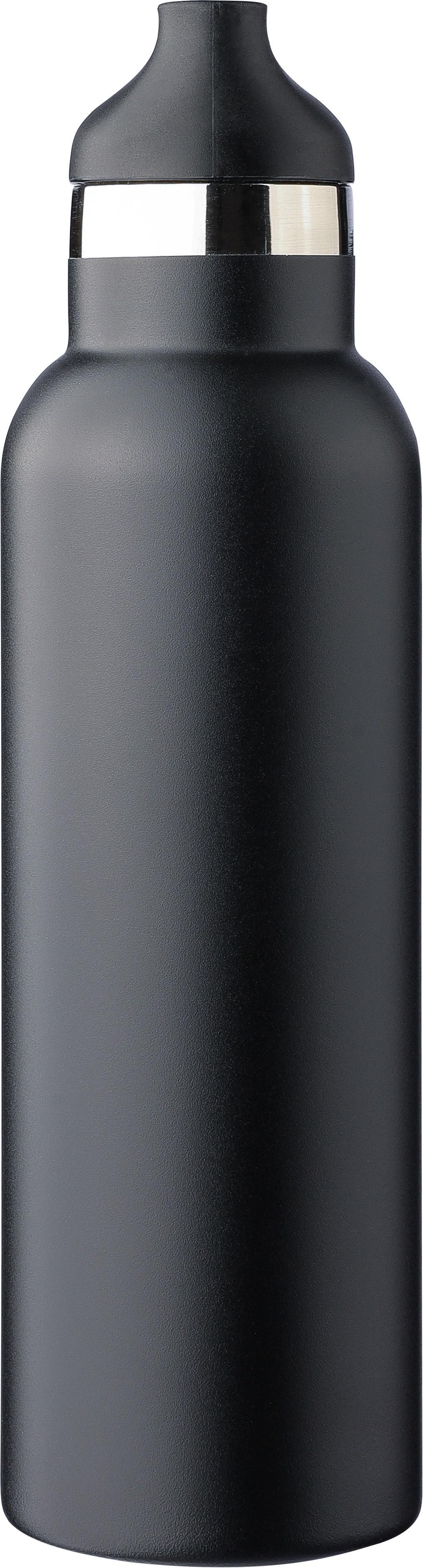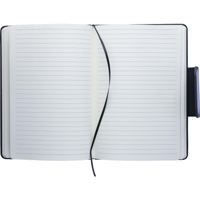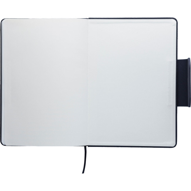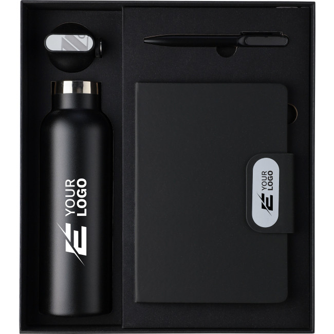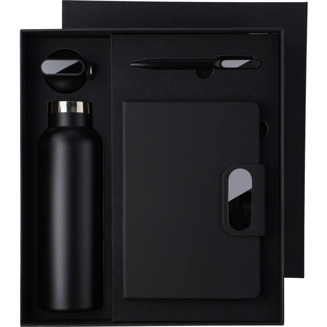 Confezione regalo in cartone nero, composto da borraccia a doppia parete in acciaio inox riciclato 304 interno ed esterno e cinturino in silicone, penna a sfera a rotazione in alluminio riciclato con refill blu, e taccuino in PU riciclato con 80 fogli di carta a righe da 70?g/m² certificata FSC. Il taccuino è dotato di segnalibro e chiusura magnetica in metallo con targhetta effetto canna di fucile. Tutti gli articoli presentano il logo del materiale riciclato, inciso sulla borraccia e sulla penna, in rilievo sul taccuino.