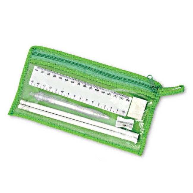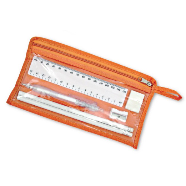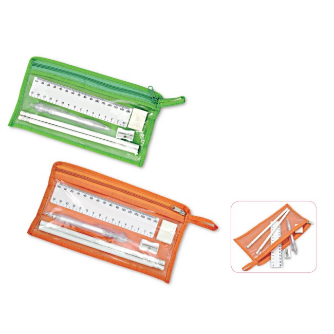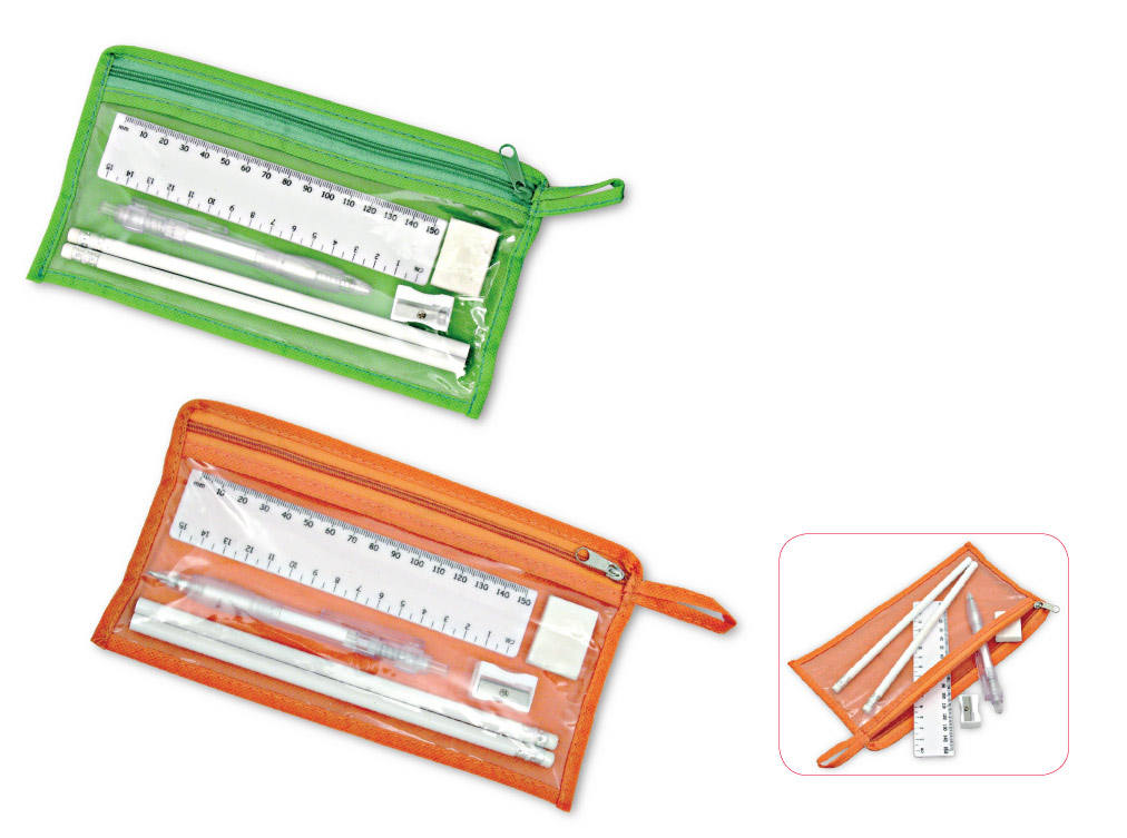 Porta oggetti all'interno due matite, righello da 15 cm.,gomma, temperino, penna a sfera.