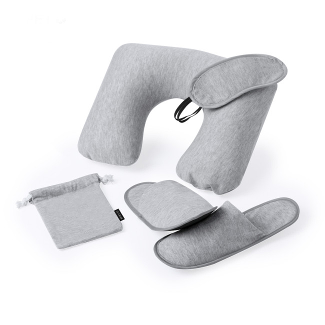 Set da viaggio pratico e morbido, composto da un cuscinetto ergonomico per il collo, una maschera per gli occhi con cinturino regolabile e pantofole abbinate. Tutti gli accessori possono essere riposti facilmente nell'astuccio in RPET, un materiale realizzato con plastica riciclata, contribuendo alla sostenibilità ambientale.
