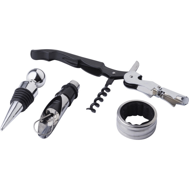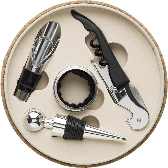 Set vino in sughero con 4 accessori, incluso coltello da cameriere, ferma bottiglia, salvagoccia e beccuccio, confezionata singolarmente in una scatola in cartone avana