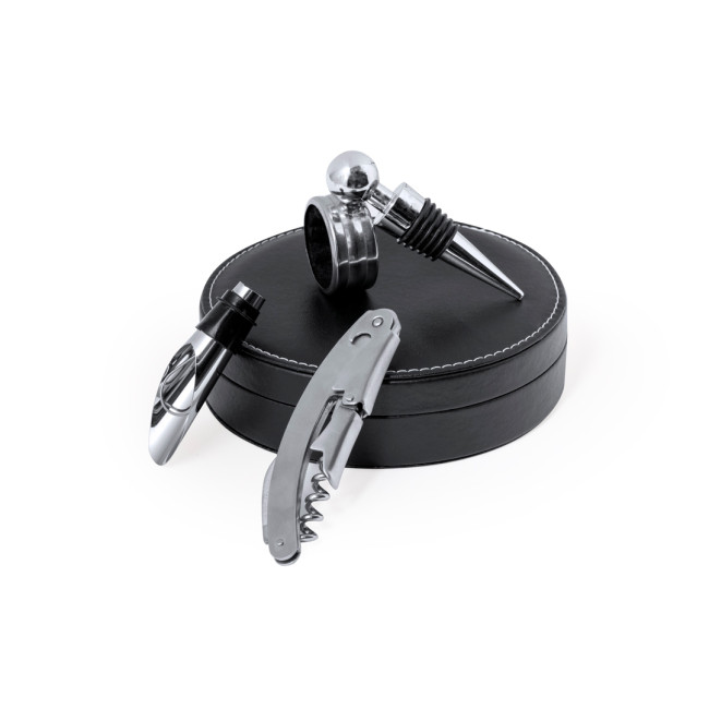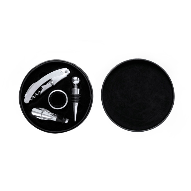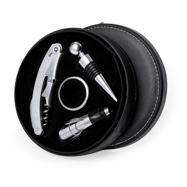 Set da vino dall'elegante design circolare rifinito in similpelle, completo di accessori in acciaio inox. Include un cavatappi a 2 tempi, tappo di sughero, dosatore e raccogli gocce. Presentato in una custodia individuale in similpelle con interno in morbida schiuma nera fustellata, è perfetto per occasioni speciali.
