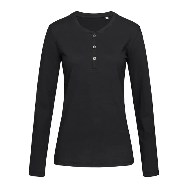 100% cotone ring-spun, single jersey. T-shirt manica lunga set-in, girocollo con 3 bottoni in metallo (senza nichel), tessuto slub, struttura con cuciture laterali, etichetta strappabile.