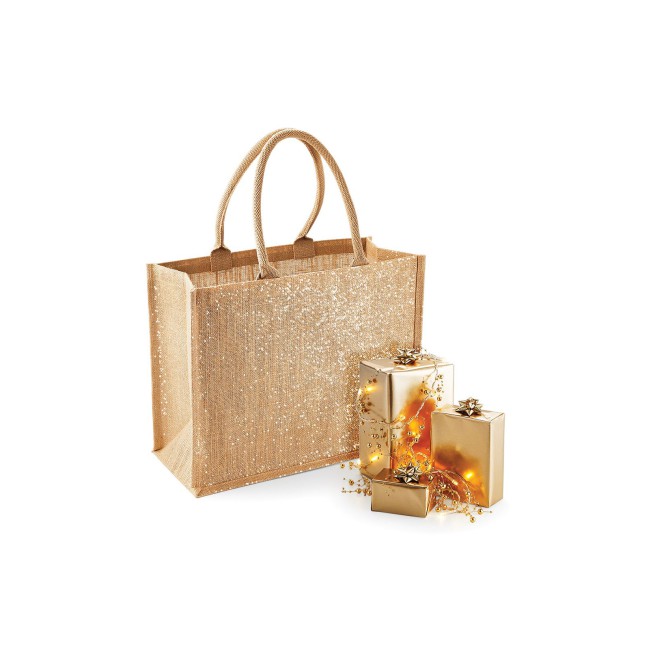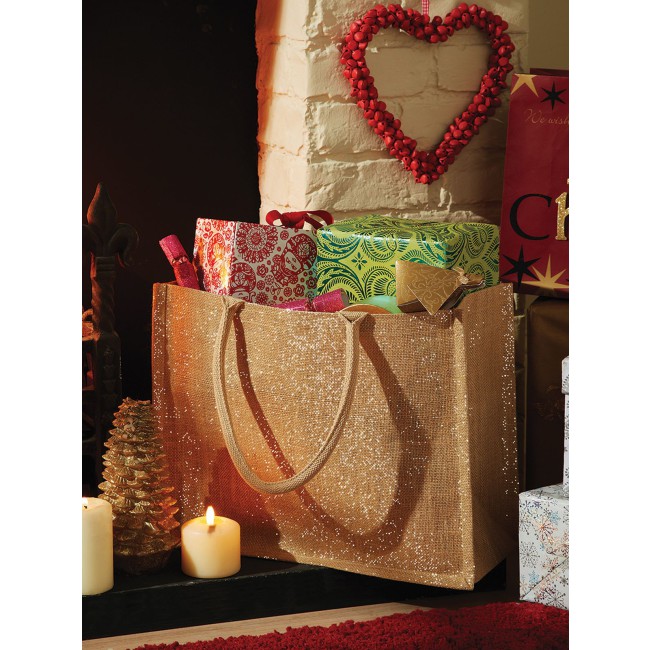98% Iuta laminata 2% Fibra metallizzata. Shopper con manici in cotone (lunghezza: 55 cm), dimensioni: 42 x 33 x 19 cm, capacita': 21 litri, area stampabile: 34 x 24 cm. Etichetta removibile.