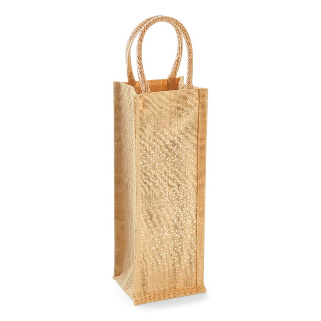 98% Juta laminata, 2% Fibra metallizzata. Borsa porta bottiglia. Etichetta removibile. Lunghezza manici: 29 cm, dimensioni: 12 x 35 x 11 cm, capacita': 4 litri, area stampabile: 8,5 x 24 cm.