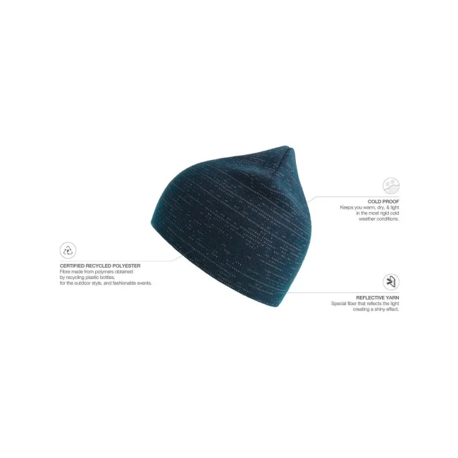 100% poliestere riciclato certificato. Berretta in acrilico con fibre riflettenti. Etichetta removibile.