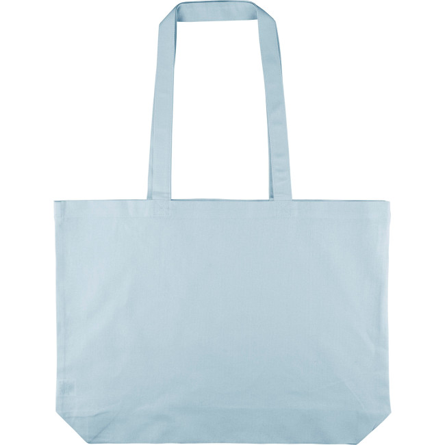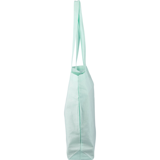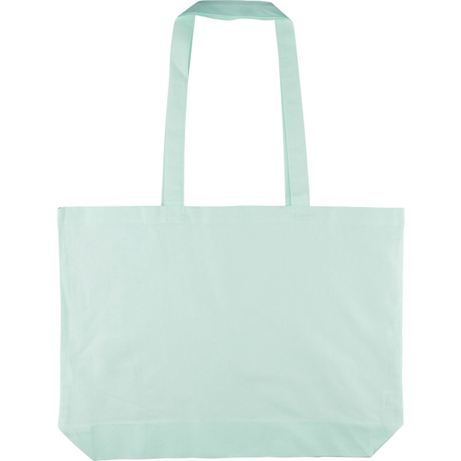 Shopping bag in cotone Oeko-Tex® 140 g/m², soffietto da 10 cm e manici lunghi 70?cm e larghi 2,5?cm, cotone in colori pastello in PMS 9562U (verde), 162U (arancione), 317U (blu) e 522U (viola), etichetta Oeko-Tex® inclusa.