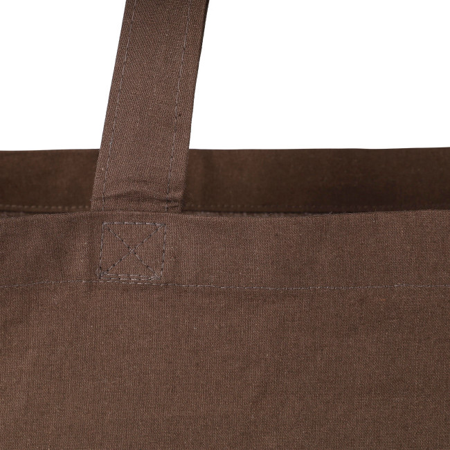 Shopping bag in cotone Oeko-Tex® 180 g/m², dimensioni 43 × 34 cm e soffietto a D da 13 cm, manici lunghi 67?cm e larghi 3?cm, etichetta Oeko-Tex® inclusa.