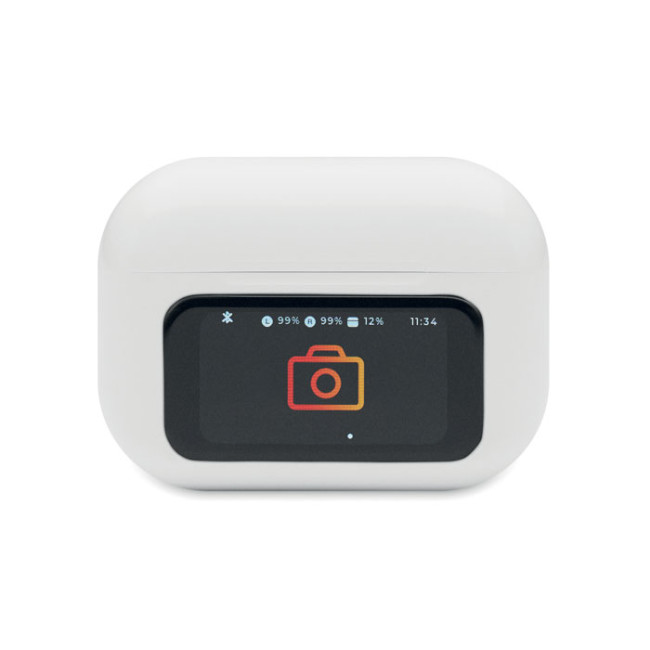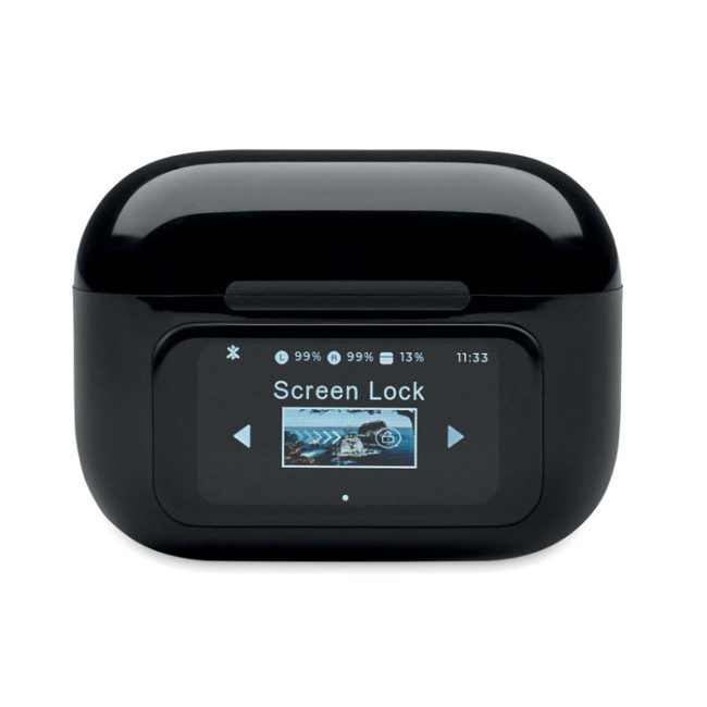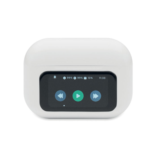 Auricolari stereo True Wireless Stereo (TWS) 5.0 in ABS (30 mAh) con ANC/ENC, microfono e base di ricarica da 230 mAh. Display touch screen.