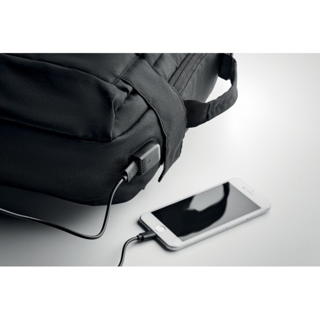 Zaino portapc in poliestere riciclato 300D. Spallacci imbottiti, un grande comparto interno adatto a un laptop da 16' e cavo di ricarica USB.