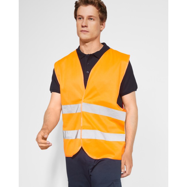 Gilet ad alta visibilità con · due bande riflettenti sul petto e sulla schiena. · Collo a V e chiusura regolabile con velcro.