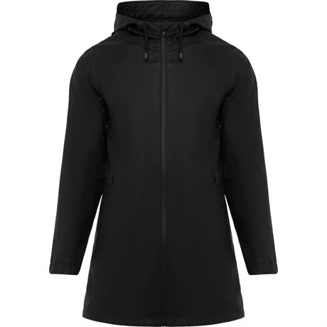 Giacca da pioggia impermeabile da donna.Cappuccio fisso con visiera.Zip centrale tono su tono con tirante.Dettagli in cotrasto nel colore nero.Due tasche laterali.Parte bassa posteriore con apertura.