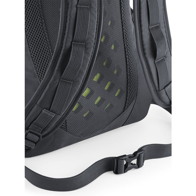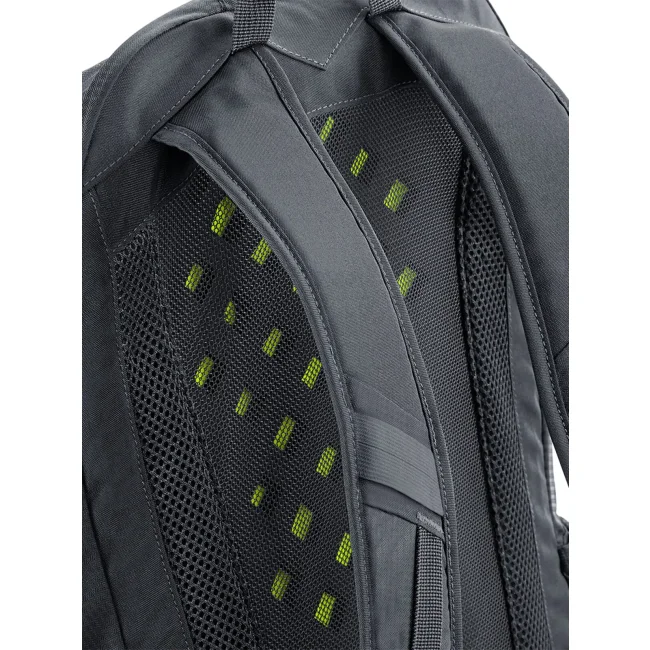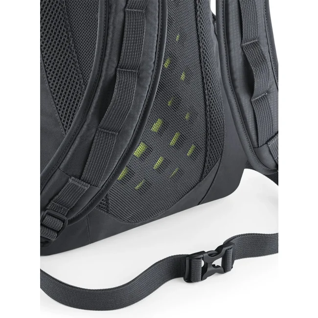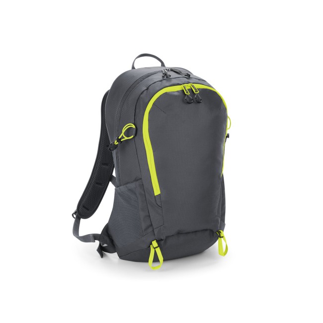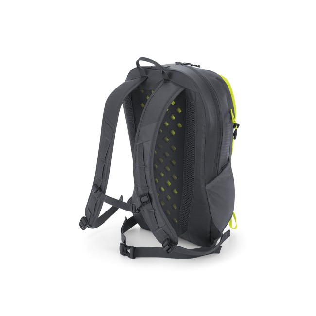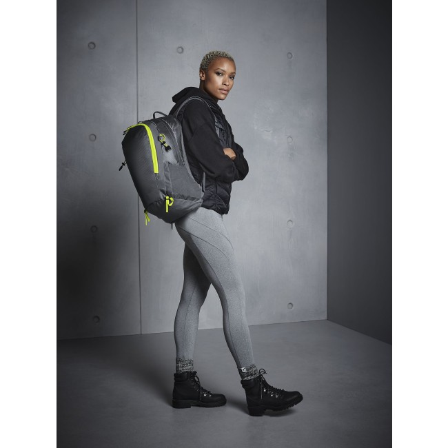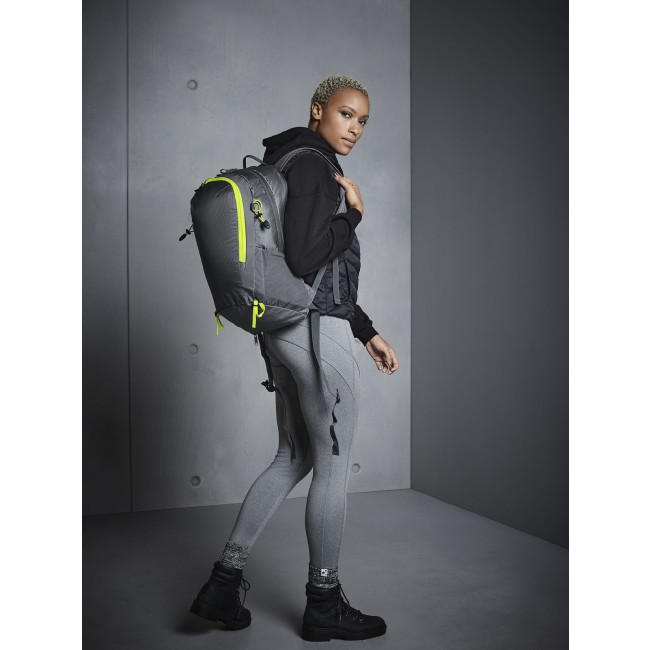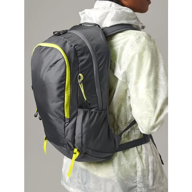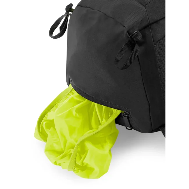 100% poliestere 210D. Zaino ultraleggero, con attacco per bastoncini da trekking, tessuto resistente all'acqua, copertura impermeabile rimovibile, tasca anteriore e interna con cerniera, tasche laterali in rete elastica, pannello posteriore ventilato, inserti riflettenti, con manico. Etichetta strappabile. Dimensioni: 30x50x21 cm, capacità: 25 litri, area di stampa: 20x25 cm.