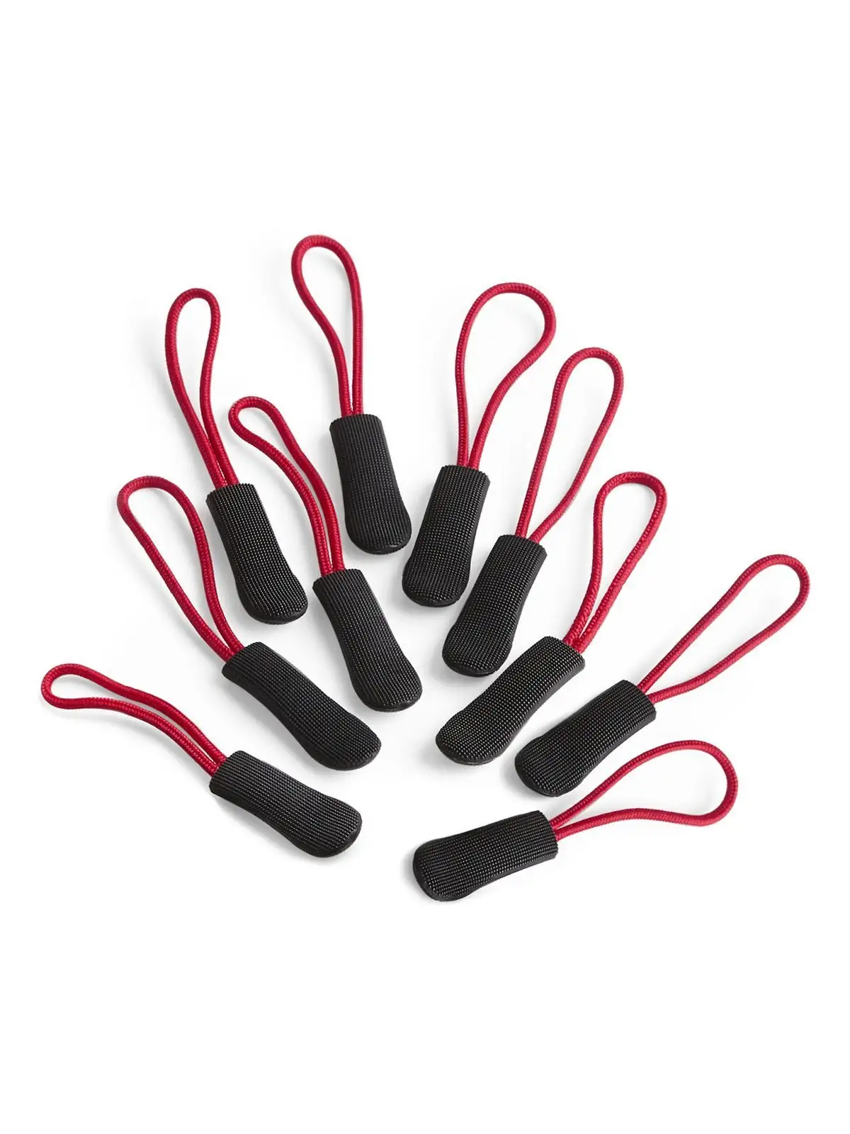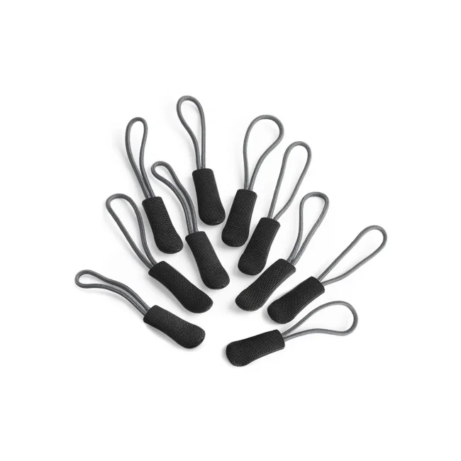 100% poliestere. Ganci con struttura antiscivolo, 10 estrattori zip per set. Dimensioni: 1x7 cm.