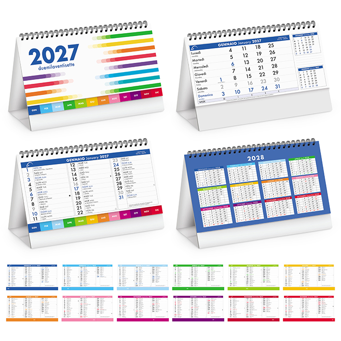 calendarietto spiralato da tavolo mensile 13 fogli fustellati carta usomano 90gr supporto cartoncino binaco 450gr