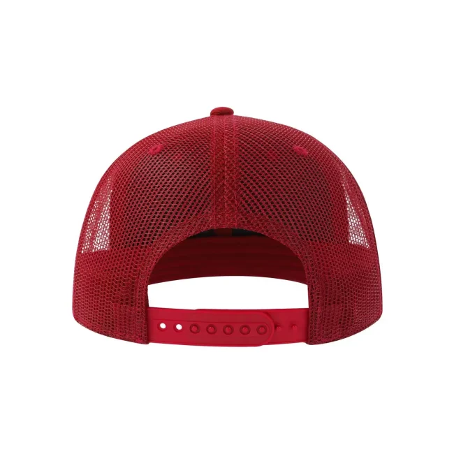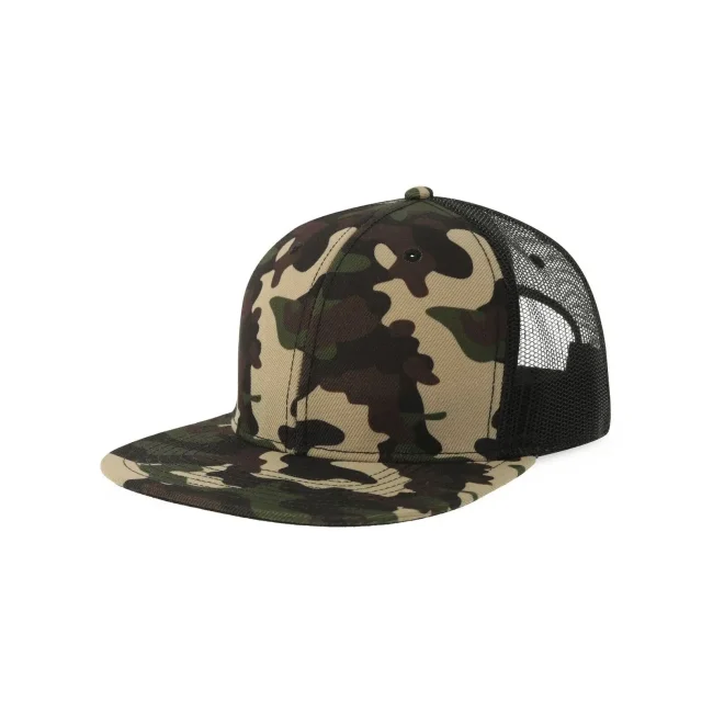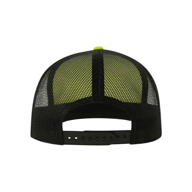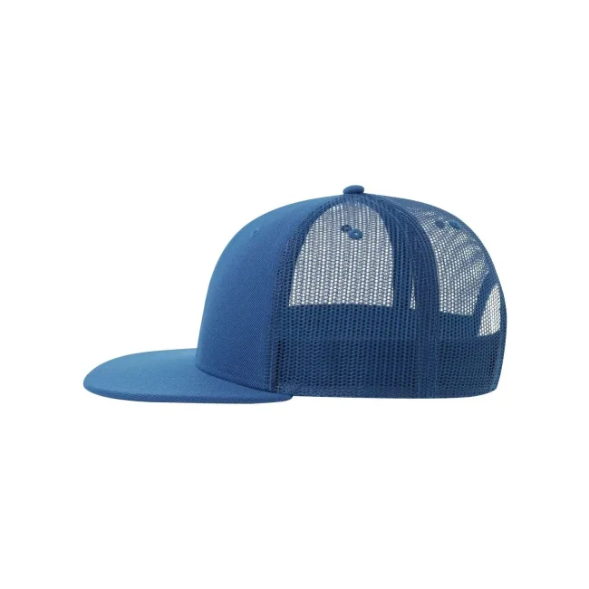 100% poliestere riciclato. Cappello 6 pannelli in poliestere riciclato, visiera piatta, rete laterale e posteriore in poliestere riciclato, chiusura snapback in pvc, etichetta removibile.
