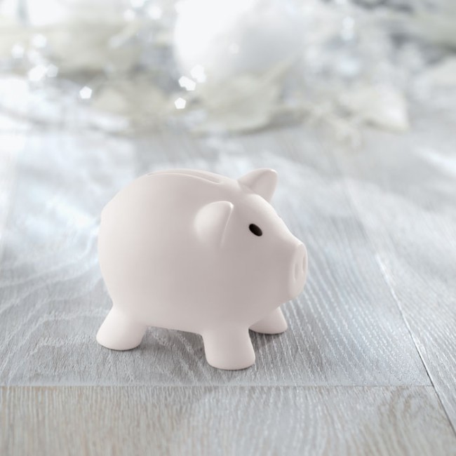 Maialino salvadanaio in PVC con tappo in ABS sul fondo.