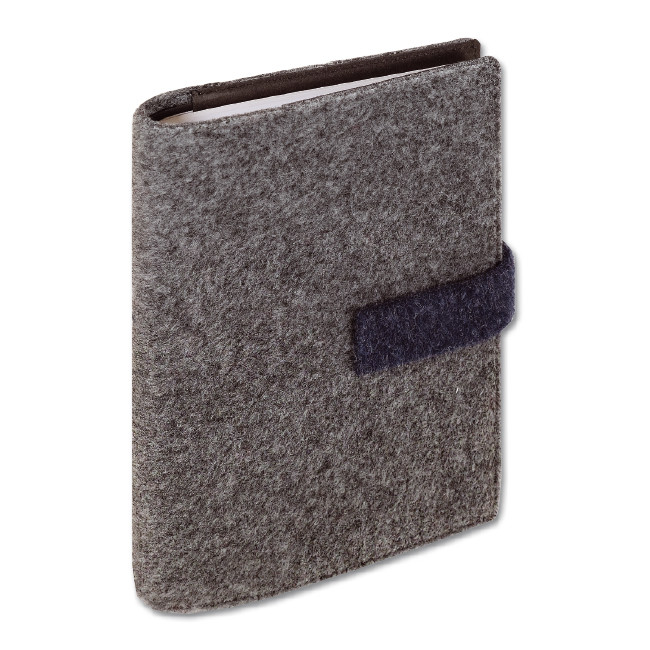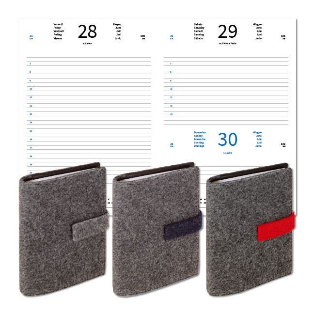 Agenda giornaliera 14,3x20,3 a portotafoglio in R-PET, ricavato dal riciclo delle bottiglie . Grafica in carta bianca da 60 gr. certificata FSC. Composta da 320 pagine, con sabato e domenica abbinati e compresa di rubrica al fondo.