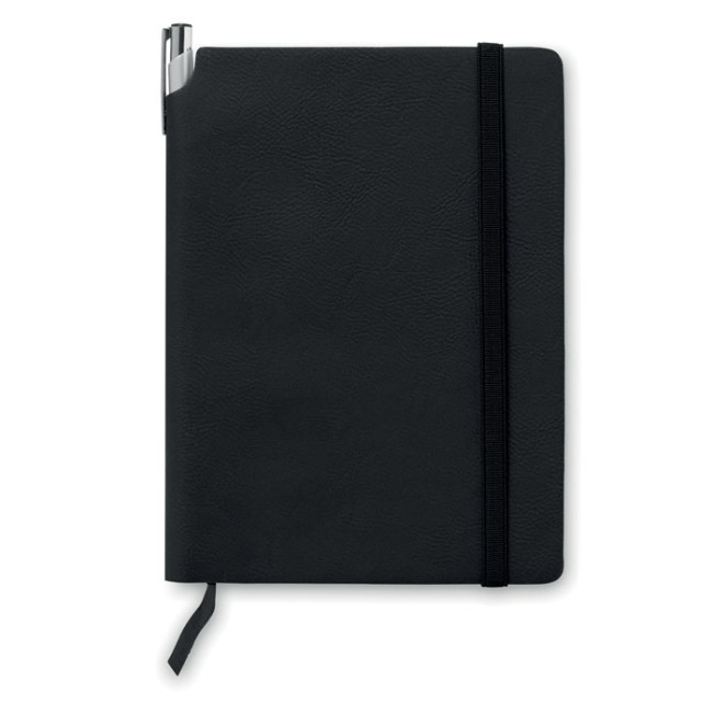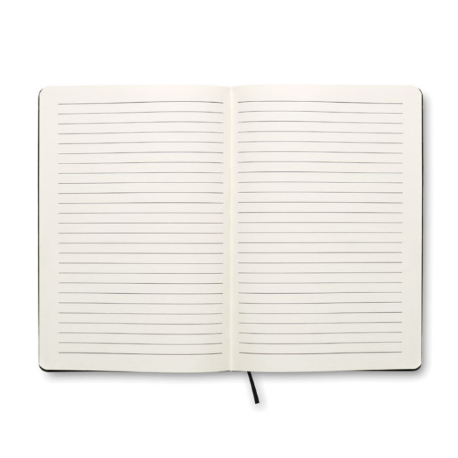 Notebook A5 con morbida copertina in PU. 160 pagine riciclate a righe (80 fogli). Cinturino di chiusura elastico in tono e segnalibro in nastro. Tasca interna espandibile nella parte posteriore. Portapenne.