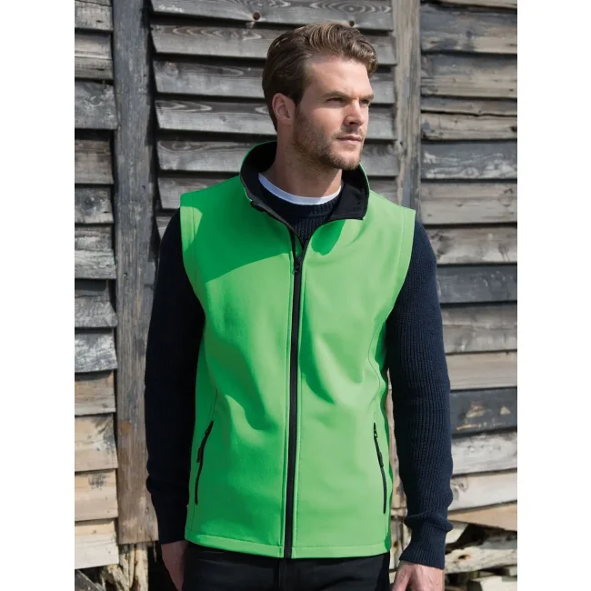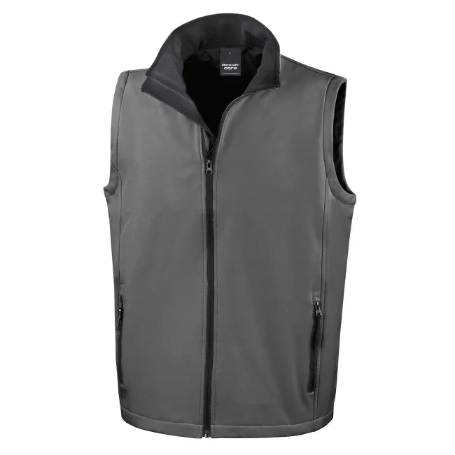 100% poliestere. La composizione del prodotto è in fase di conversione al polistere riciclato. Si prega di notare che è in corso la transizione delle giacenze. Giacca smanicata in softshell a due strati, con interno in micropile, antivento e traspirante, zip frontale con protezione per il mento YKK, 2 tasche laterali con zip.