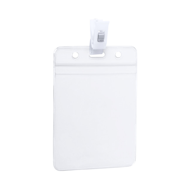 Badge in PVC fustellata con clip bianca. Disponibile in versione orizzontale e verticale.