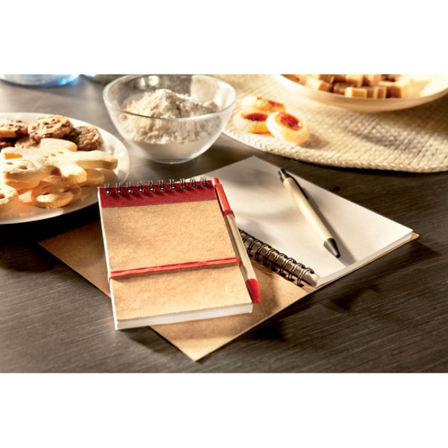 Notebook in carta riciclata con penna abbinata. Doppia spirale. 140 pagine di carta riciclata normale (70 fogli). Penna a sfera a pulsante abbinata in cartone riciclato e plastica biodegradabile. Inchiostro blu. Cinturino elastico di chiusura e portapenne. FSC®-certified | FSC MIX, P7.1, FSC-C213206