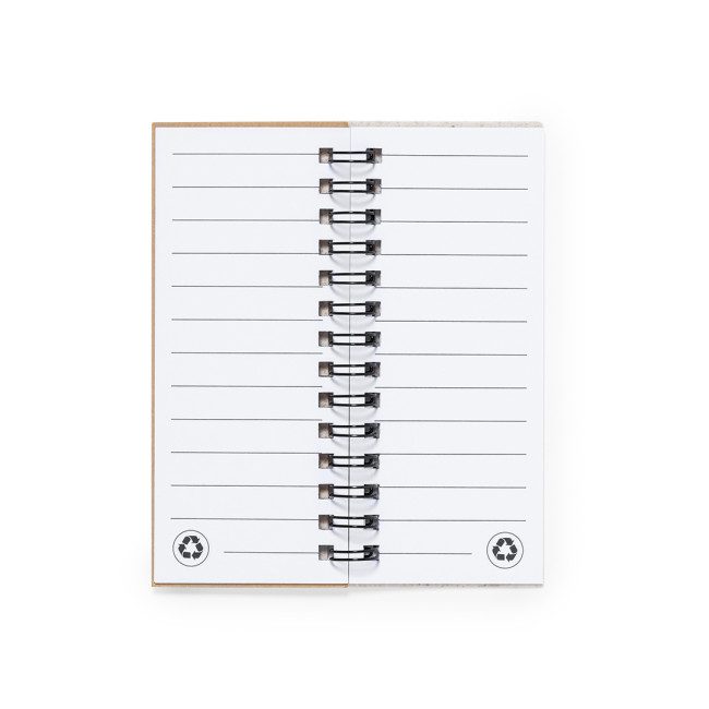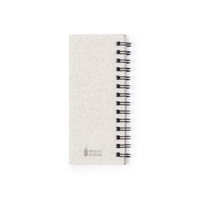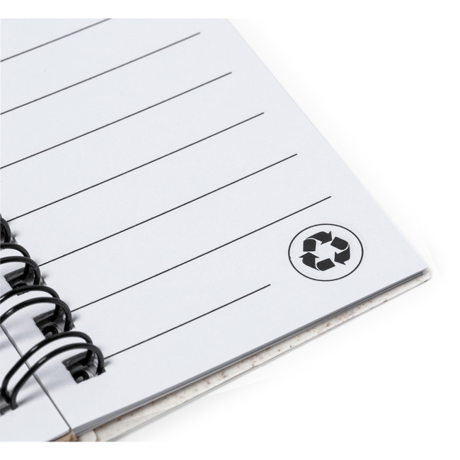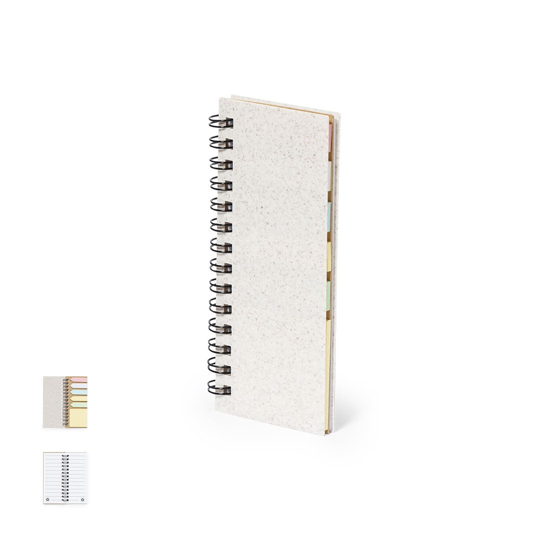 " Taccuino con copertina in fibra di grano. Con etichetta iwheat straw sul retro della copertina. Include:Raccoglitore ad anelli bianco da 30 fogli con layout a righe e etichetta riciclata su entrambi i lati.25 note adesive medie.125 mini note adesive in vari colori. Realizzato con elementi di origine vegetale per promuovere l'uso di materie prime naturali e ridurre le emissioni inquinanti.Presentati in un sacchetto individuale riciclato".