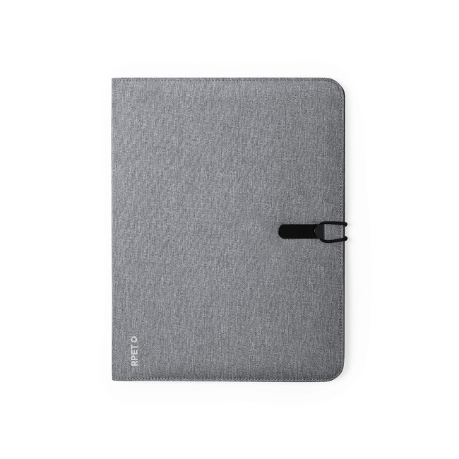 Elegante cartella della linea natura in formato A4. Realizzato in resistente RPET 600D effetto melange, plastica riciclata per favorire il riutilizzo dei rifiuti plastici e contribuire alla sostenibilità del pianeta. Dettagli neri e chiusura in metallo con nastro elastico appositamente progettato per la stampa laser. Interno con taccuino rimovibile da 20 fogli a righe singola, 3 tasche con patta, portacarte e portapenne. Etichetta distintiva con logo RPET nell'angolo.