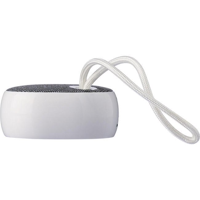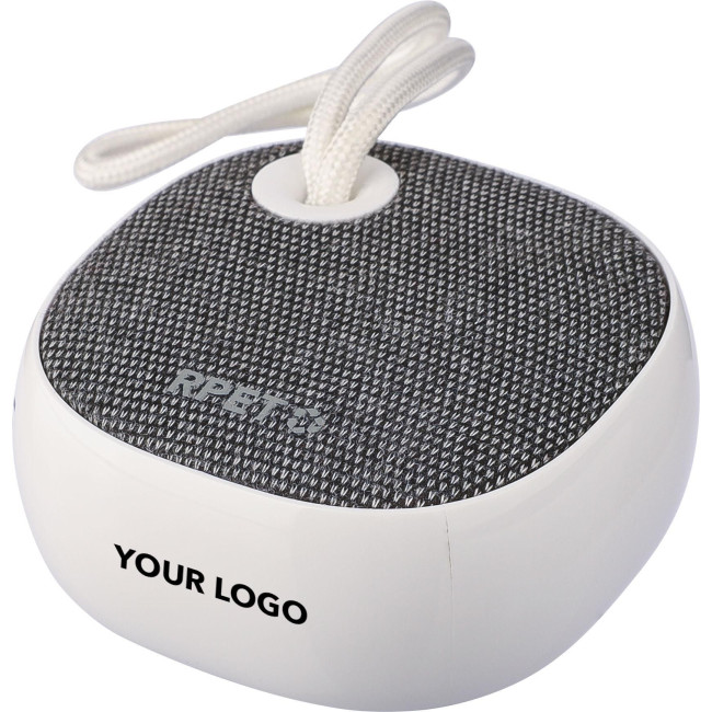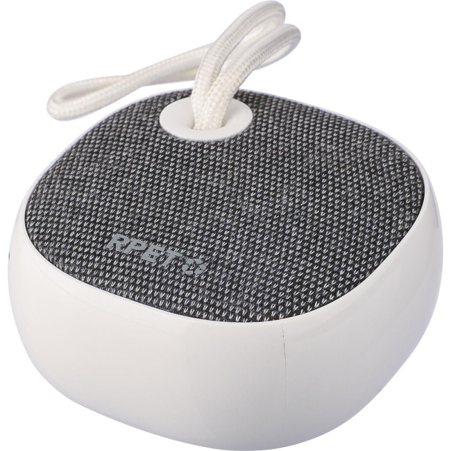 Speaker wireless in ABS riciclato e tessuto rPET con piccolo cavo di trasporto in nylon, capacità della batteria 300 mAh con uscita da 3W, tecnologia wireless versione 5.3 e raggio d'azione di 10 metri, tempo di ricarica di circa 2 ore con un tempo di riproduzione di 2-3 ore, include un cavo di ricarica USB-C bianco da 30 cm, logo rPET sul tessuto e logo ABS riciclato sul lato, confezionato singolarmente in una scatola di cartone avana.