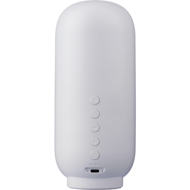 Speaker 3-in-1 in ABS riciclato e tessuto rPET con funzione luce e terapia del sonno. Dispone di un altoparlante da 3W, tecnologia wireless (versione 5.3) e una batteria Li-ion da 1.200 mAh. Dotato di quattro luci LED calde e sei suoni rilassanti per il sonno: Ruscello, Ninna Nanna di Brahms, Onde del Mare, Notte Silenziosa, Suono Fetale e Rumore Bianco. Offre tre livelli di luminosità e un timer con impostazioni di 15, 30 e 60 minuti. Facile passaggio tra modalità wireless e silenzioso, utilizzando il pannello di controllo a cinque pulsanti sul retro. Include cavo per la ricarica bianco da 1 metro, confezionato singolarmente in una scatola di carta kraft.