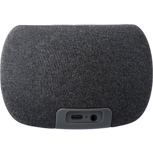 Speakeri wireless in bambù e ABS riciclato con dettagli in tessuto intorno al diffusore, uscita 5W, ingresso DC 5V, batteria ricaricabile integrata da 1200mAh con 6 ore di autonomia, distanza operativa di 15-20 metri, rapporto segnale/rumore di 87 dB, gamma di frequenza: 100 Hz a 20 kHz, include cavo per la ricarica Type-C da 50 cm, tecnologia di connessione wireless: 5.2, la ricarica wireless da 5W, confezionato singolarmente in una scatola in cartone avana