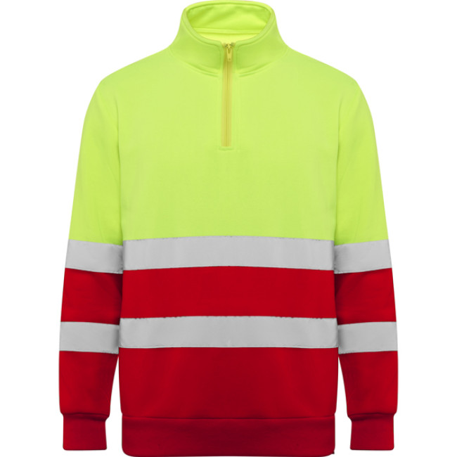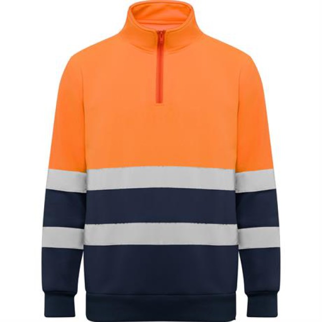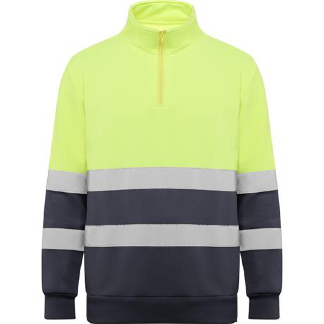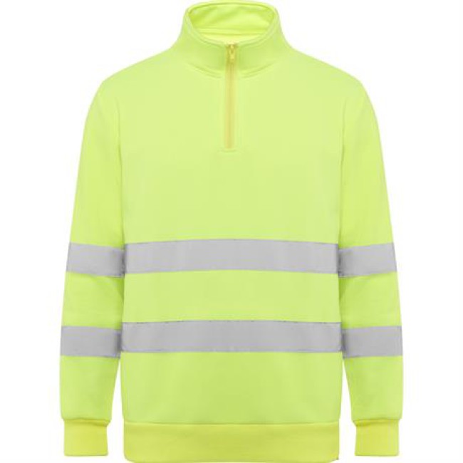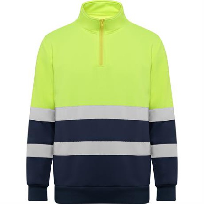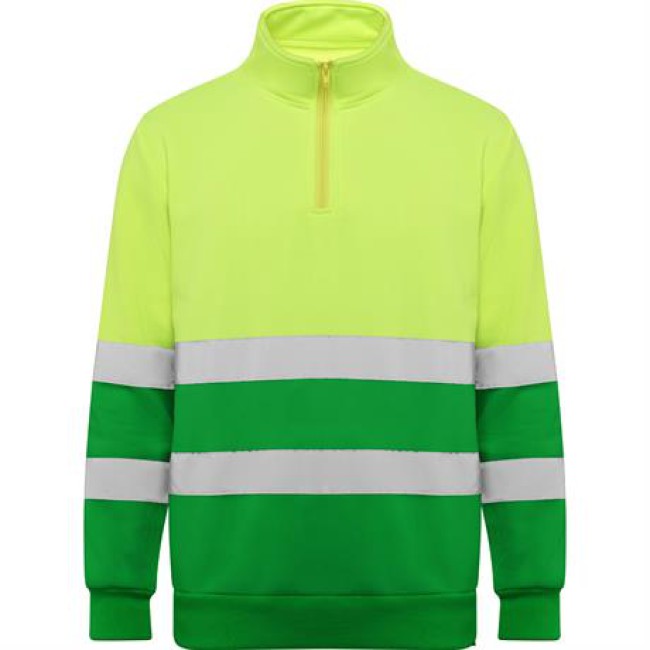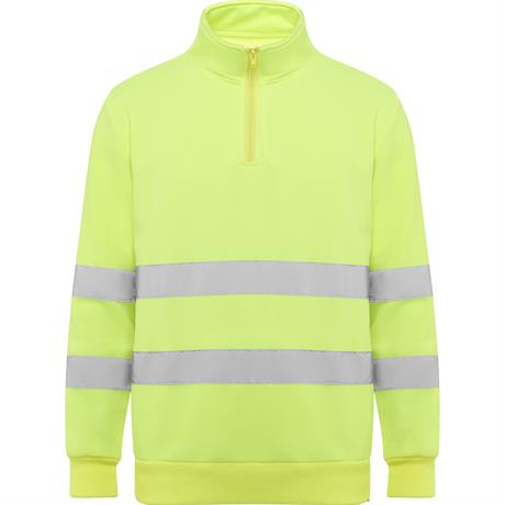 Felpa alta visibilità con zip di misura.· Collo alto con mentoniera e puller.· Due bande rifrangenti orizzontali su busto e maniche.· Cuciture di copertura rinforzate all'interno del collo.· Costine 1x1 su polsini e orlo.