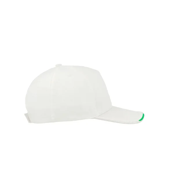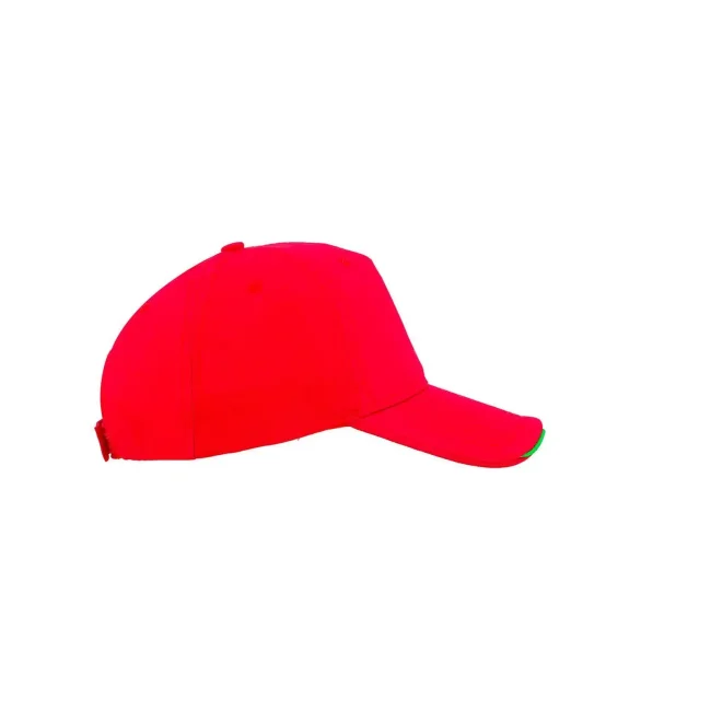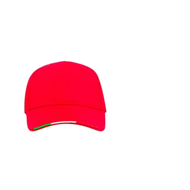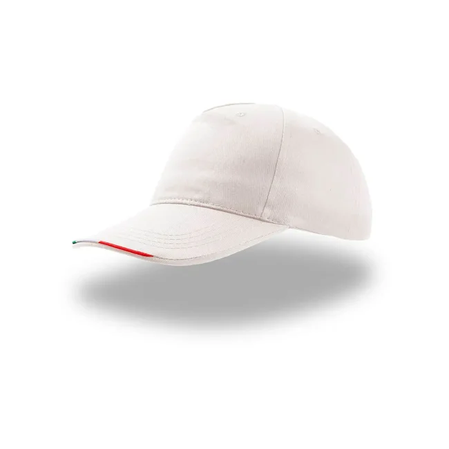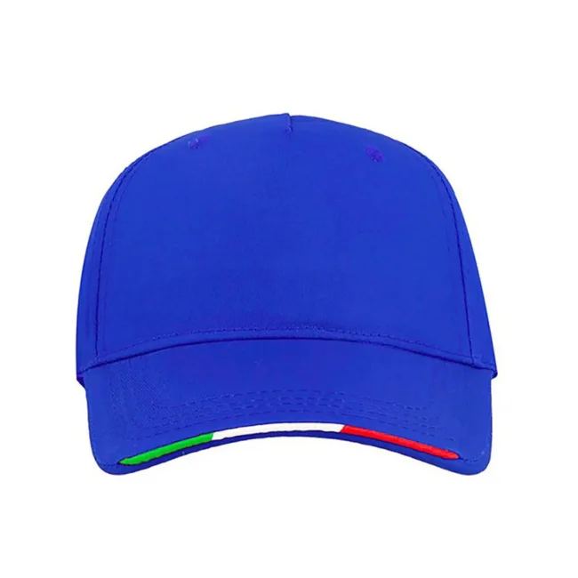 100% cotone twill. Cappellino a 5 pannelli, banda con bandiera italiana e chiusura con velcro a strappo, taglia unica.